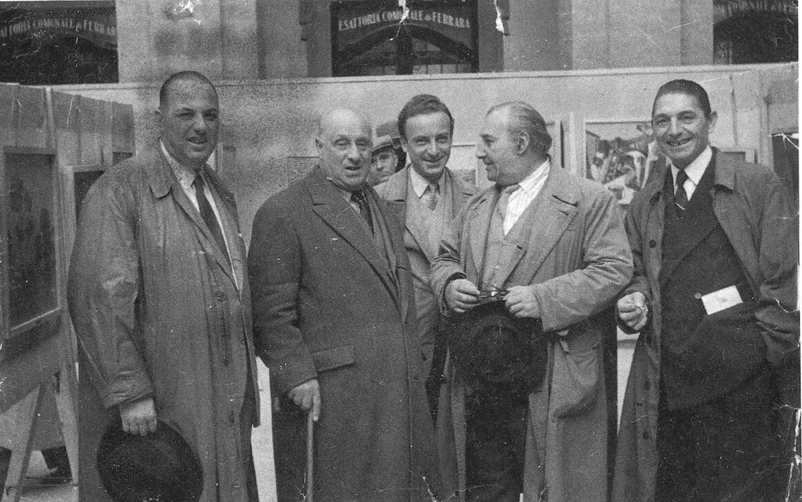 Alfeo Capra (il primo a destra) ad una mostra, insieme ad Aguiari, Morelli, Melli e Zaccarini. Foto scattata a Ferrara nel 1952.